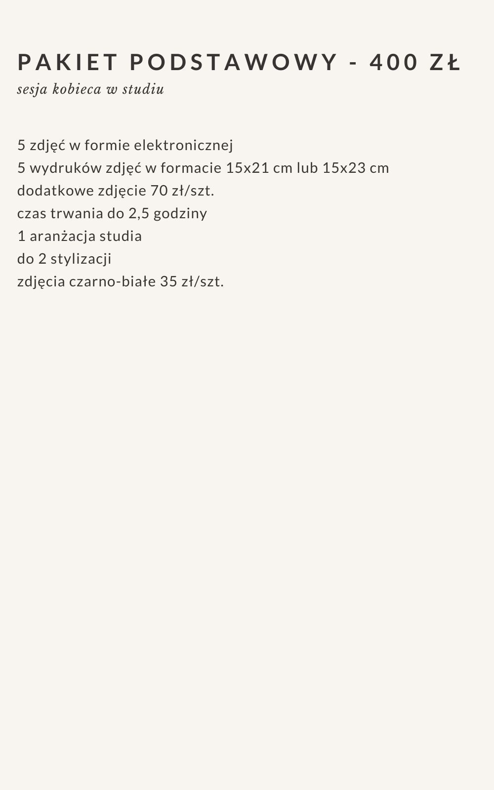 Termin sesji zarezerwuj tak, by nie było konieczności wizyty w studiu prosto z pracy, w tzw. biegu. Sesja kobieca, tym bardziej buduarowa prosto z pracy to moim zdaniem nieporozumienie.